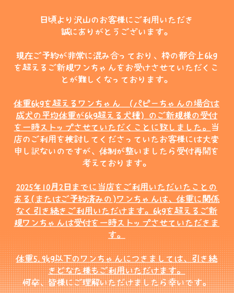 2025年10月3日〜 体重6kgを超えるご新規ワンちゃん(パピーちゃんの場合は成犬の平均体重が6kgを超える犬種)のご新規様受付を一時ストップさせていただくことに致しました🙏🙏🙏 初めてのご利用をご検討くださっていたワンちゃんの飼い主様には大変申し訳ないのですが、ご予約が非常に混んでおり受け入れが難しくなっております。今後、体制が整いましたら受付再開を考えておりますので、定期的に当店HPやSNS等で最新情報をご確認いただけましたらと思います。ご不便をお掛け致しますが何卒ご理解頂けましたら幸いです。